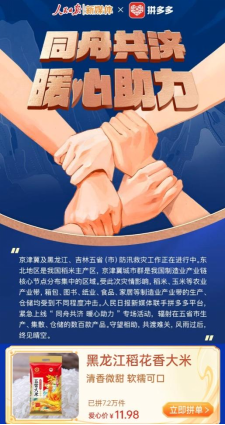 此后,为帮助受灾地区商家减少损失,拼多多相继推出了“加油涿州”图书专场活动与“同舟共济 暖心助力”帮扶专场活动,号召全国网友拼一单。通过在活动专场内设置“加油河北”“加油东北”与“加油京津冀”等专区,重点推介各地区的产业带好物,并给予流量倾斜,帮助受灾地区商家减轻因水灾带来的生产和仓储损失,加速复工复产。