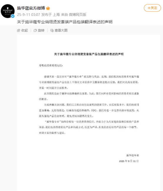 近日,施华蔻专业烫发产品包装标签说明用词不当引发用户关注,品牌在发现问题后第一时间响应,以诚恳态度公开致歉,并快速展开全面核查,展现出对消费者反馈的高度重视与负责任的品牌担当。