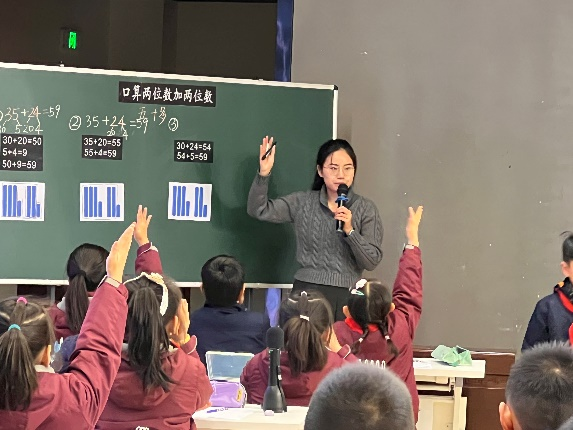 第一节课由陈秋彤老师执教,陈老师给了学生大量的自主探究和沟通交流的时间。学生在陈老师的引导下,通过自主学习充分理解了算理,完成了算法的优化。在《两位数加两位数》教学分享中,吴老师强调数学教学应坚守“数形结合”核心,以“相同数位上的数相加减”为根本算理,通过数位图等直观工具将抽象数字具象化,帮助学生筑牢算理基础。她特别指出,学具使用需紧扣教学目标,避免“为用而用”,要着力引导学生经历“具象感知→抽象概括”的思维进阶,在弱化对学具依赖的过程中,逐步培养抽象思维能力。