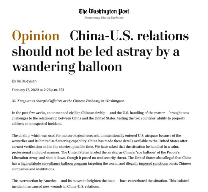 中新网2月18日电 据中国驻美国大使馆消息,当地时间2月17日,中国驻美国使馆徐学渊临时代办在美国《华盛顿邮报》发表题为《中美关系不应因“流浪气球”随风逐流》的署名文章。全文译文如下:
