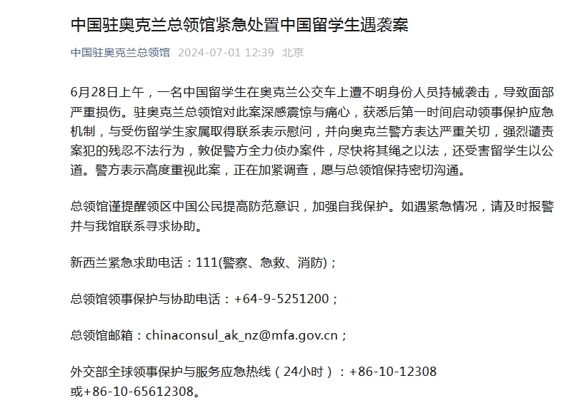 中新网7月1日电 据中国驻奥克兰总领馆官方微信消息,6月28日上午,一名中国留学生在奥克兰公交车上遭不明身份人员持械袭击,导致面部严重损伤。驻奥克兰总领馆对此案深感震惊与痛心,获悉后第一时间启动领事保护应急机制,与受伤留学生家属取得联系表示慰问,并向奥克兰警方表达严重关切,强烈谴责案犯的残忍不法行为,敦促警方全力侦办案件,尽快将其绳之以法,还受害留学生以公道。警方表示高度重视此案,正在加紧调查,愿与总领馆保持密切沟通。
