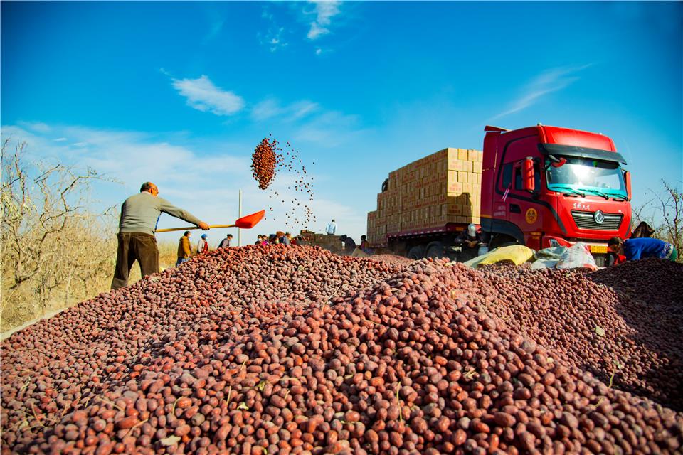 兴起的红枣产业也成为当地群众务工增收的重要渠道。在洛浦县早上农业开发有限公司,院落里是堆成山的灰枣、骏枣,数名工人正在进行初级分捡;车间里,清洗、烘干、分捡、包装,各道工序井然有序。该公司除了80余人的固定员工队伍,每年红枣收购旺季都会招用一批临时工,茹则妮萨·亚森就是其中之一。“在这里每天收入有200元左右,每年的红枣采摘季我都会来这里务工。”熟练分捡红枣的茹则妮萨笑着说。