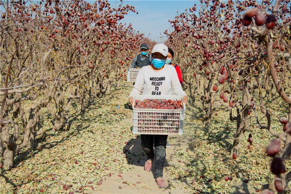 图为村民正在枣园里搬运收捡红枣。买买提艾力摄