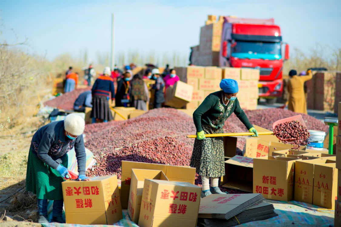 寒冬凛冽,新疆洛浦县依然冬阳和暖。12月9日,在该县拜什托格拉克乡依提帕克吾斯塘村的红枣晾晒场,枣农买吐送·麦提托合提带着家人正在将晾晒好的红枣装箱打包。“这是最后一批红枣,收购商早就预定了,今天发完,今年的枣就卖完收工啦!”买吐送喜笑颜开地说道。自10月底开始,买吐送一家就奔走忙碌在枣园里,打枣、捡枣、晾晒、分拣、装箱、销售,红红的大枣将一家人的生活也映衬得红红火火的。