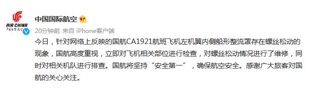 中新网7月7日电 据中国国际航空官方微博消息,今日,针对网络上反映的国航CA1921航班飞机左机翼内侧船形整流罩存在螺丝松动的现象,国航高度重视,立即对飞机相关部位进行检查,对螺丝松动情况进行了维修,同时对相关机队进行排查。国航将坚持“安全第一”,确保航空安全。感谢广大旅客对国航的关心关注。