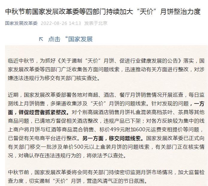 中新网8月26日电 据“国家发展改革委”微信公众号26日消息,中秋节前国家发展改革委等四部门持续加大“天价”月饼整治力度。