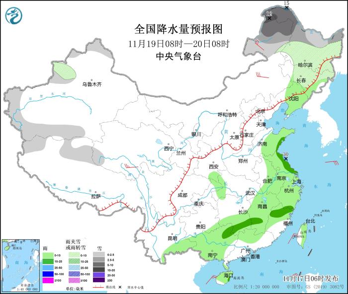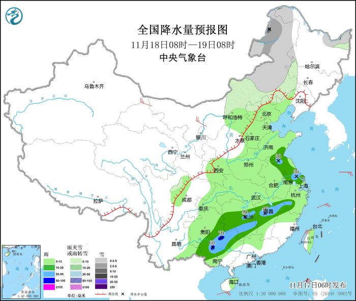 图1 全国降水量预报图(11月17日08时-18日08时)