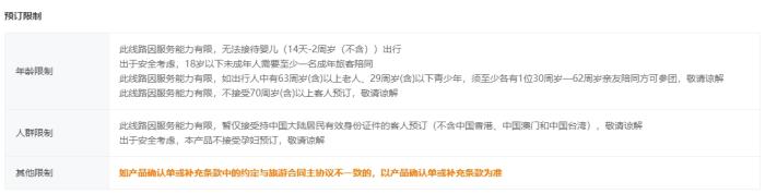 某云南跟团游产品预订限制。 截图自某在线旅游服务平台。
