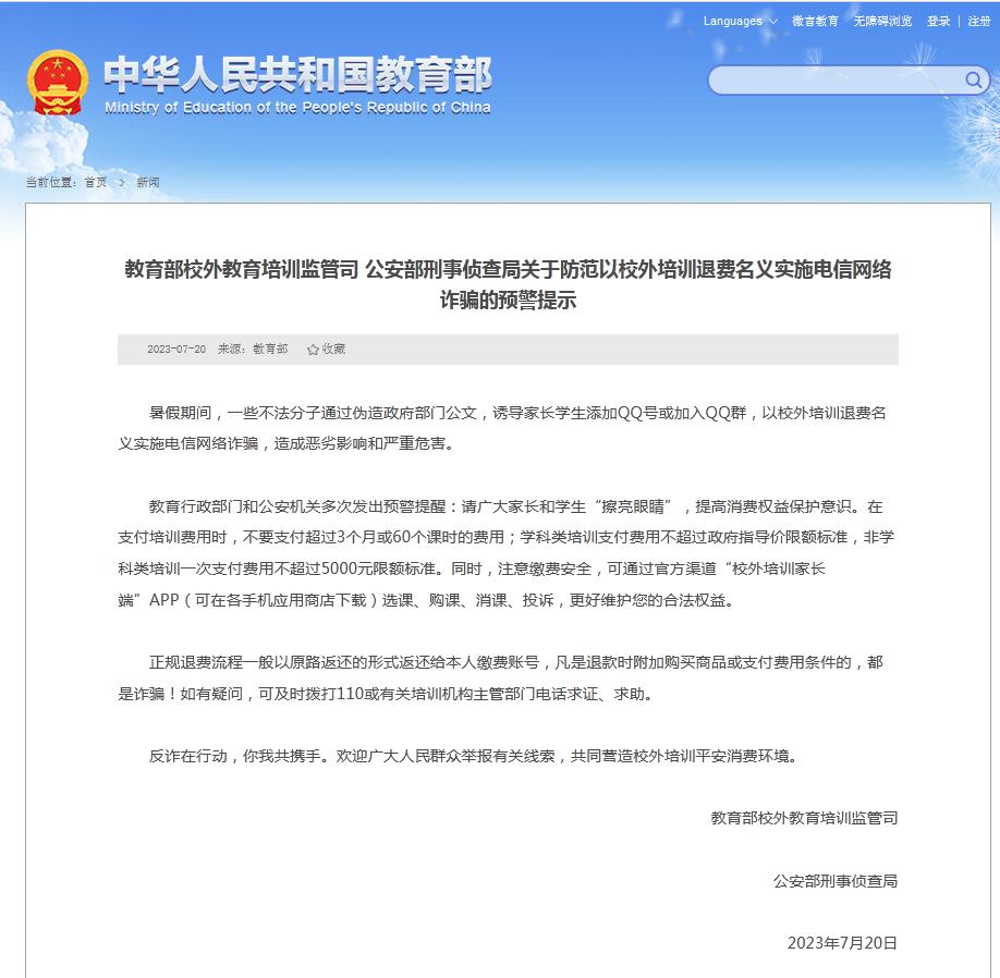 中新网7月20日电 据教育部网站消息,教育部校外教育培训监管司、公安部刑事侦查局20日发布预警提示,提醒防范以校外培训退费名义实施电信网络诈骗。