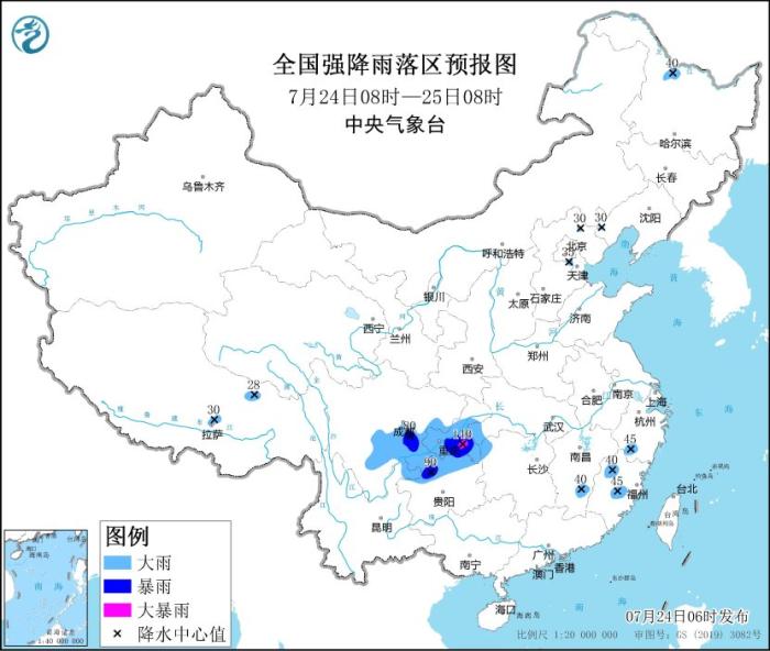 7月24日08时至25日08时,四川盆地中南部、重庆大部、贵州北部、云南东北部、湖北西南部、湖南西北部以及华北东部、浙江南部、福建中北部、江西南部、黑龙江北部、西藏东部等地部分地区有大到暴雨,其中,重庆南部等地局部地区有大暴雨(100~140毫米)(见图2)。内蒙古中部、浙江东部等地的部分地区有4~6级风。