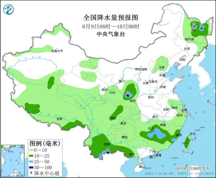 8月7日08时至8日08时,黑龙江东部、新疆伊犁河谷、西藏东南部、甘肃东南部、陕西中南部、四川西部和南部、云南、贵州西部、广西西部和南部、浙江、福建、江西北部等地部分地区有中到大雨,其中,陕西中南部、福建东部、云南中南部、广西西部和南部沿海等地部分地区有暴雨(50~90毫米)。内蒙古中部、辽东半岛、新疆沿天山地区、山东半岛等地部分地区有4~5级风(见图1)。
