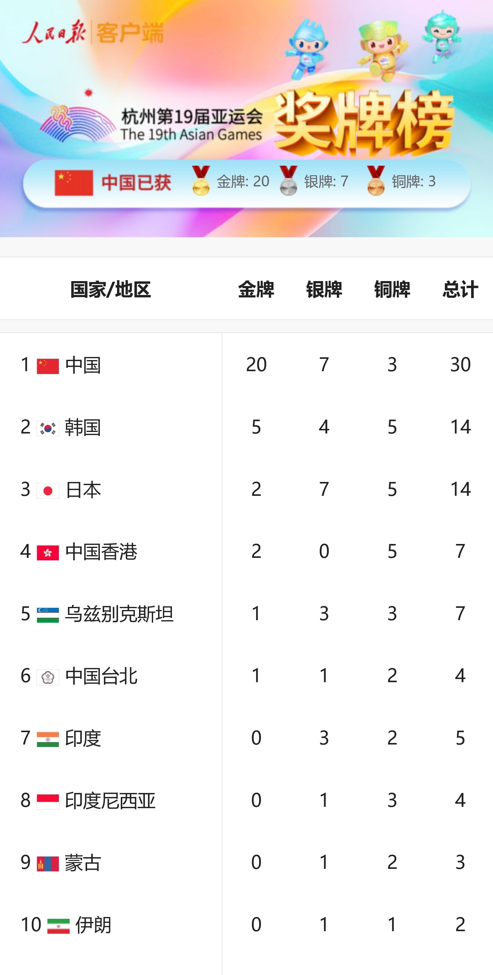 今天,杭州亚运会开幕后首个比赛日,中国队获得20金7银3铜,位列奖牌榜第一名。其中,中国赛艇队3小时内连续斩获6金;中国游泳队包揽7金,且在每个项目中都打破了纪录。祝贺!继续加油!