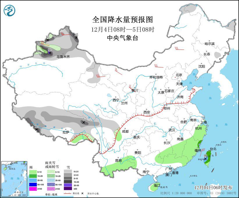 12月4日08时至5日08时,新疆北部、甘肃河西、青海南部、西藏中东部和南部、川西高原北部等地部分地区有小到中雪或雨夹雪,其中,新疆阿勒泰山区和伊犁河谷、西藏南部等地部分地区有大到暴雪,局地大暴雪(20~22毫米)。湖南南部、江西南部、浙江大部、福建、广东东部和北部、广西西部、云南南部、海南岛、台湾岛等地部分地区有小到中雨,其中,台湾岛中南部等地部分地区有大雨(25~40毫米)。新疆北疆北部、内蒙古大部、甘肃河西等地部分地区有4~6级风。