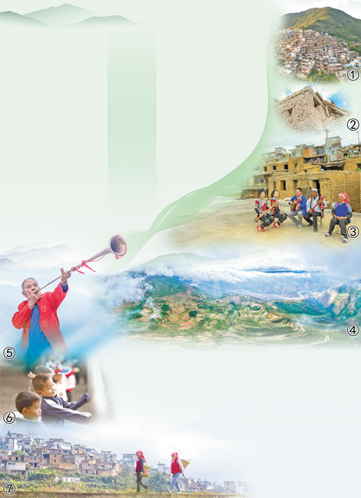 图⑤:苍台村村民吹奏过山号。过山号音调独特、音质醇厚,是彝族人民歌舞欢聚时常用的乐器。