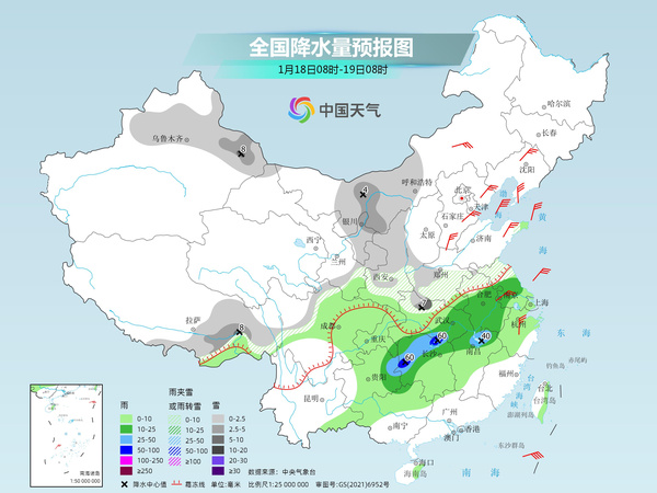 具体来看,今天,新疆北部、西北地区东部、内蒙古中西部、黄淮西部和南部、江淮北部、湖北西北部以及西藏东部等地部分地区有小到中雪或雨夹雪,局地有大雪。江淮南部、江汉东部、江南北部和西部、西南地区东南部等地部分地区有中到大雨,其中,湖北南部、湖南东北部和西部等地部分地区有暴雨。