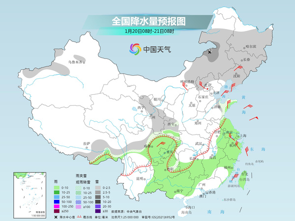 明天,新疆沿天山地区、甘肃南部和河西地区、陕西北部、内蒙古中西部和东南部、山西大部、河北西北部、山东东部、河南南部、苏皖中北部、湖北北部等地部分地区有小到中雪或雨夹雪,局地有大雪。江南中北部和西部、西南地区东南部、华南北部等地部分地区有中到大雨,其中,湖南东北部、江西西北部等地部分地区有暴雨。