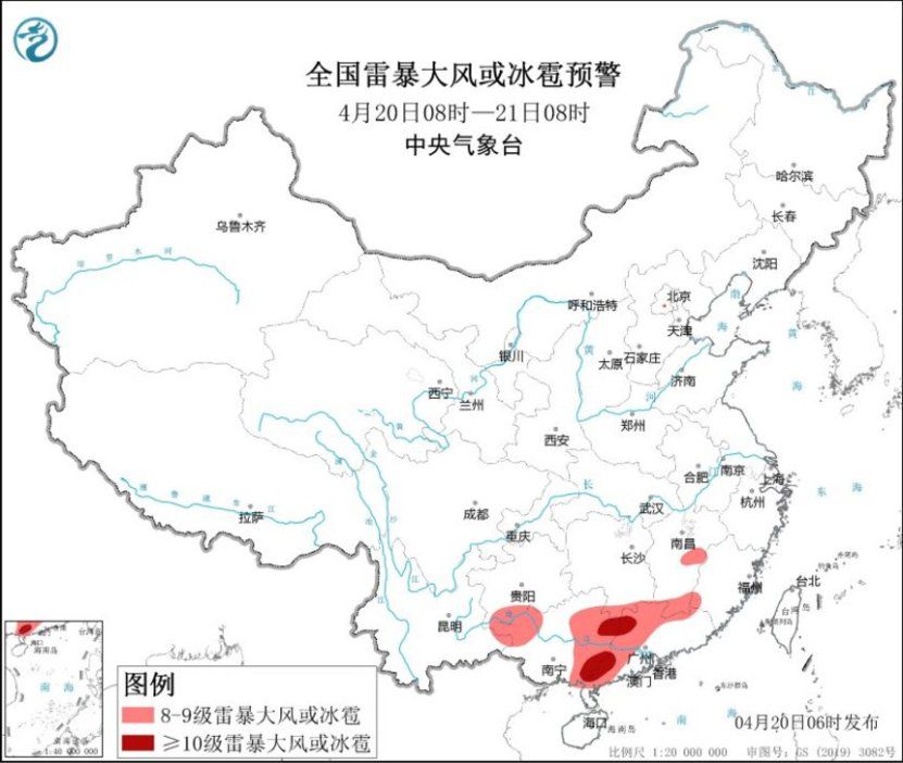 预计,4月20日08时至21日08时,贵州南部、江南南部、华南大部及重庆中部等地有大到暴雨,其中,湖南南部、江西南部、福建西南部、广西东部、广东中北部等地部分地区有大暴雨,广东西北部局地有特大暴雨(250~280毫米);湖南南部、江西中南部、福建南部、贵州西南部、云南东南部、广西中东部、广东北部和中西部等地的部分地区将有8-10级雷暴大风或冰雹天气,其中广西东部、广东西部等地的部分地区将有10级以上雷暴大风,局地风力可达11级以上;湖南南部、江西南部、福建西部、贵州南部、云南东部、广西、广东中西部等地的部分地区将有小时雨量大于20毫米的短时强降水天气,其中广西东部和西北部、广东中西部等地的部分地区最大小时雨量大于50毫米,局地可达80毫米以上。中央气象台4月20日06时发布暴雨橙色预警,并继续发布强对流天气黄色预警。