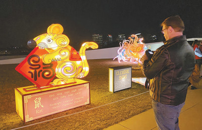当晚的音乐会结束后,大批观众还冒着严寒来到附近的室外场地,参加冬季灯展开幕式。这场为期四天的灯展也是华盛顿地区庆祝中国农历新年的重头戏之一。锣鼓声中,由中国工匠精心制作的100组彩灯惊艳亮相。十二生肖、熊猫、睡莲……浓浓的中国文化元素,吸引美国民众驻足拍照。