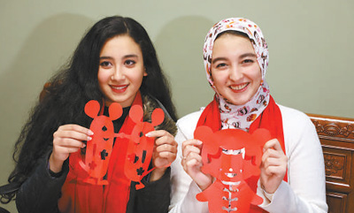 当地时间1月21日,“中埃共欢庆 同过中国年”主题春节文化体验活动在埃及首都开罗举办。图为当地两名参与者展示自己完成的剪纸。
