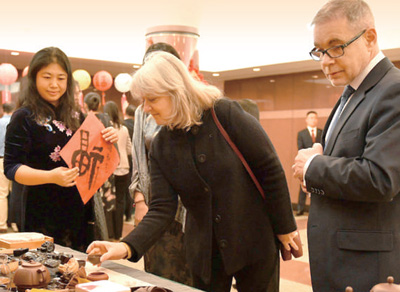 当地时间1月21日,中国常驻联合国代表团举行2020年新春招待会。图为嘉宾在品功夫茶。