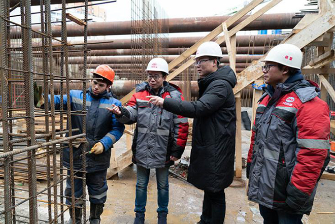 中国铁建莫斯科项目执行经理赵万里(右二)、中国铁建莫斯科地铁项目副经理兼维尔纳工区长郝启韬(左二)、中国铁建莫斯科地铁项目工程师/翻译董洪鹏(右一)与现场的俄籍施工人员进行沟通