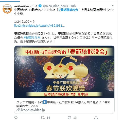 2020年1月24日晚,日本将在线直播中国春晚。来源:日本视频网站niconico官方社交媒体账户截图_副本
