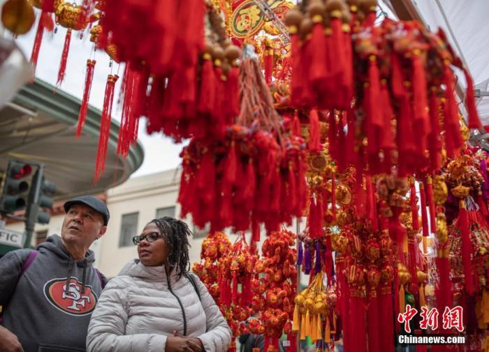 市民在旧金山“中国城”的春节花市上被各种饰品吸引。中新社记者 刘关关 摄