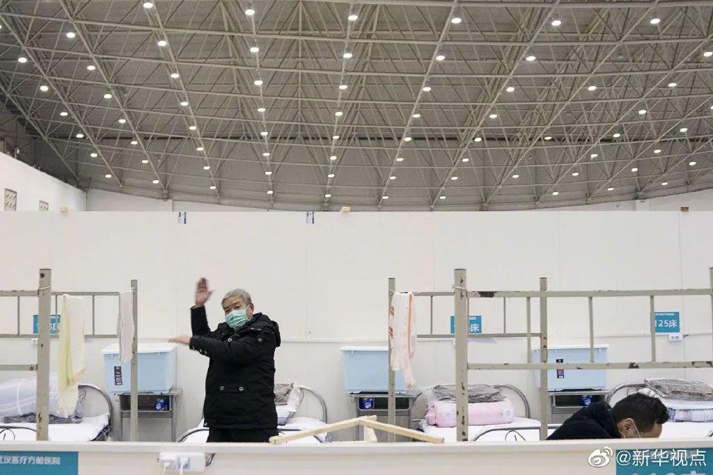 视频中,武汉方舱医院的,医生和患者一起打太极拳,带队的是一个患者大爷,在护士的号召下,多的人不断加入进来。