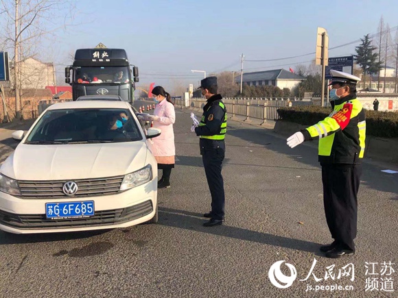 沭阳交警吴超(右一)在卡口处执勤。钱雪摄