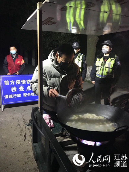 最开始,邵玉祥只是给殿山卡口的执勤人员送夜宵,现在他和家人每晚要去镇上5个卡口送。得知他们的善举,当地居民黄静东、王庆峰也自发加入,组成民间热心厨师团队,专门为各个卡口的执勤人员做夜宵,馄饨、汤圆、茶叶蛋、香干……夜宵品种也越来越多。