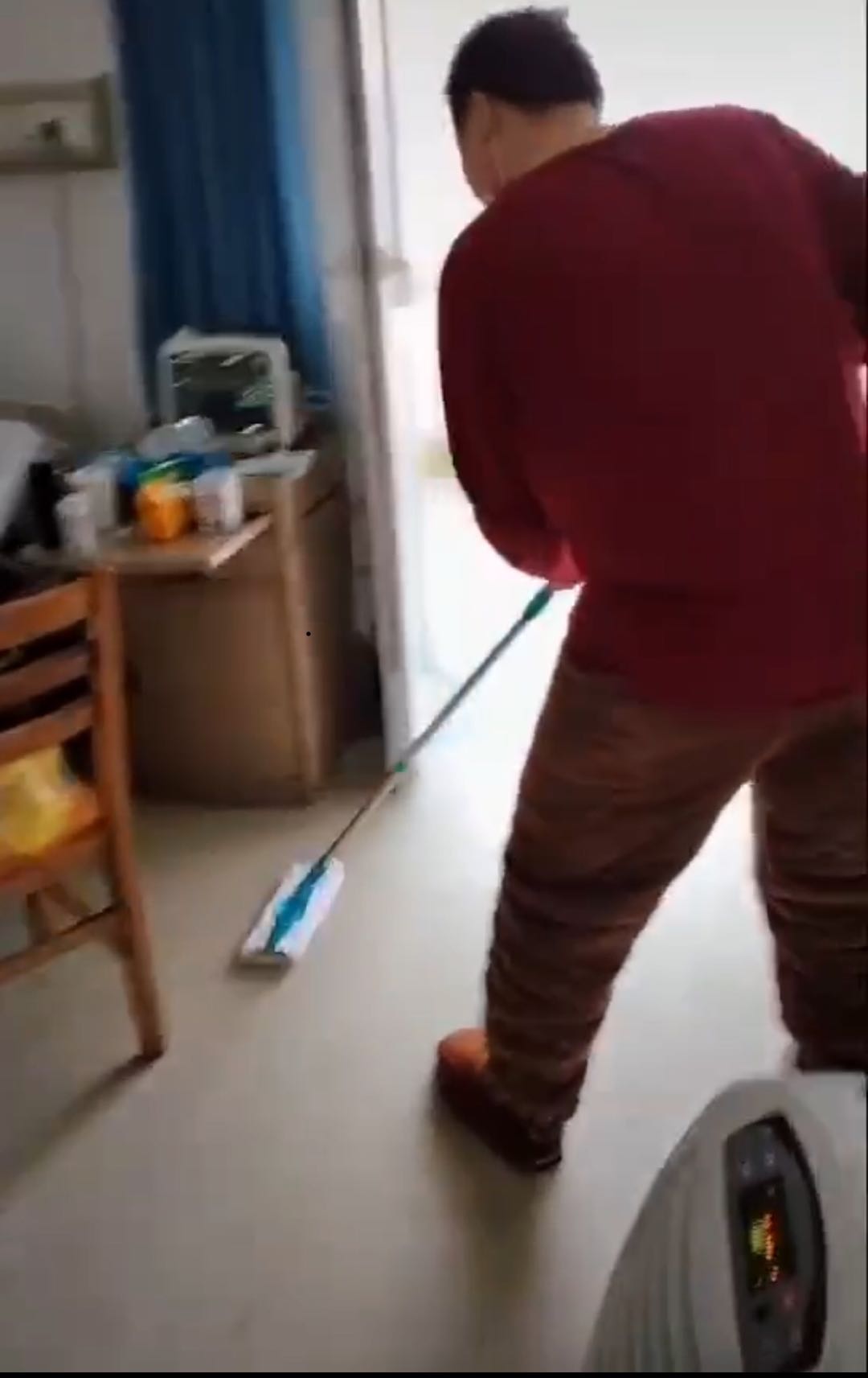 小伙子渐渐和我们的医护人员成了朋友,从躺床上翘着二郎腿的“大少爷”变成了主动帮忙干活的好青年(尽管我们希望他安心休养,但是他坚决要帮忙),他一边干活一边还说他这是在运动。今天他要出院了,护士们想与他拍张合影,他害羞地说自己不好看,坚决不肯露脸,只肯露个劳动的背影。