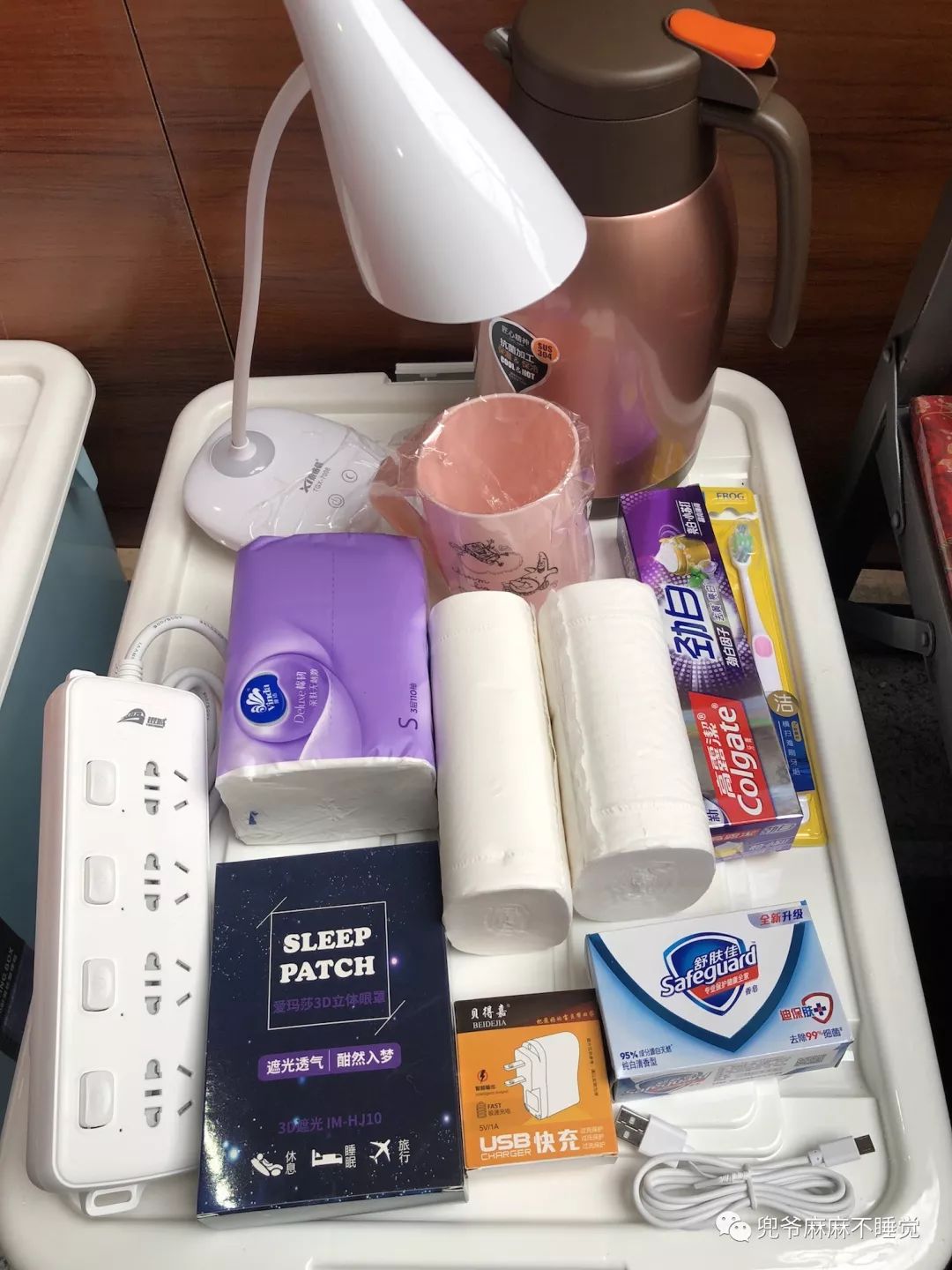 摆开来看,有牙刷牙膏、水杯、卷纸、抽纸、香皂、接线板、保温壶、充电器、眼罩耳塞、小台灯、拖鞋、毛巾、盆子,一共10多件。