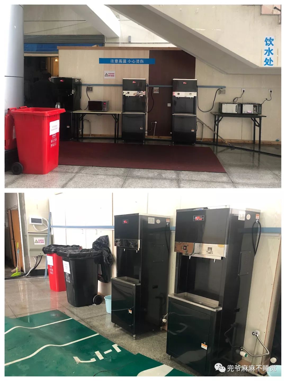 再往前走,靠近护士工作站,右手边是一排开水机和微波炉,还有分类垃圾桶。(平面图椭圆标)