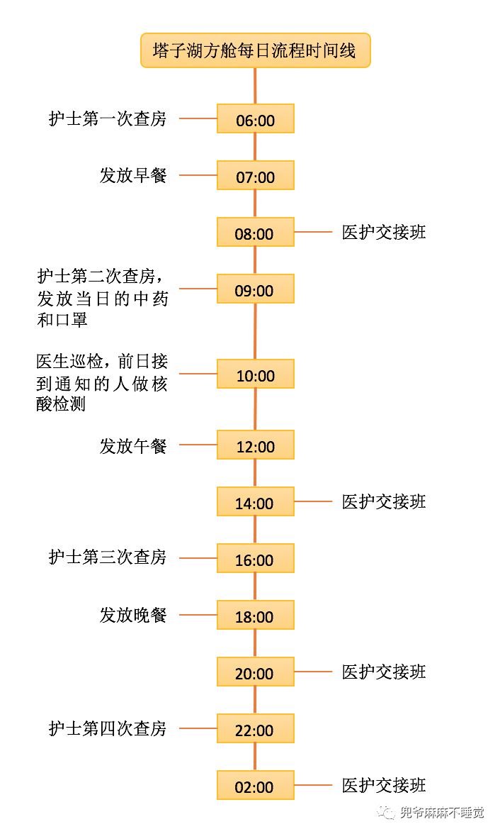 这里的医护人员每个团队是隔一天排一次班。每天4班倒,6小时一班,交接时间依次是8点、14点、20点、2点。