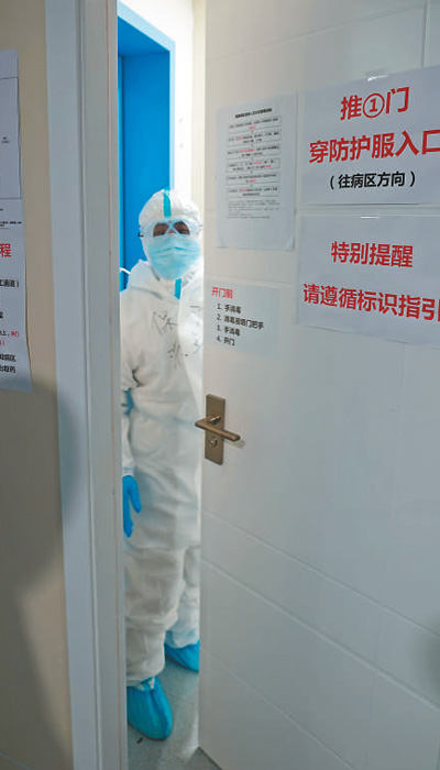 今年57岁的保洁员洪年梅负责C7东病区的环境清洁和垃圾清运工作。每次上班,她也要穿戴全套的防护装备。