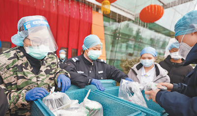 每到吃饭时间,院区大楼门外就会出现20多名工作人员,每人守着一个大保温箱,认真清点饭菜。他们是院区的物管员,负责把热腾腾的饭菜及时分发到各个病区。