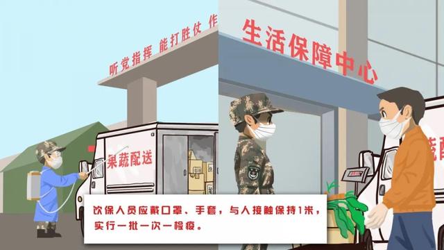 11、生活配送人员、车辆入营均需预检、筛查与消毒。验收食材双方应全程戴口罩和手套,保持间距1米以上,实行“一批一次一检疫”政策。尽量不采购海鲜、活禽等食材。