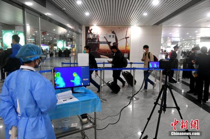 2月20日,福州长乐国际机场,务工人员通过智能测温器。中新社记者 吕明 摄