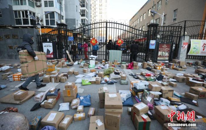 3月3日,北京朝阳区一小区门口,快递员为居民搬运快递物品。受疫情影响,许多市民“宅”在家中,网购成为消费主流,而线上下单量也随之呈现爆发式增长。中新社记者 赵隽 摄