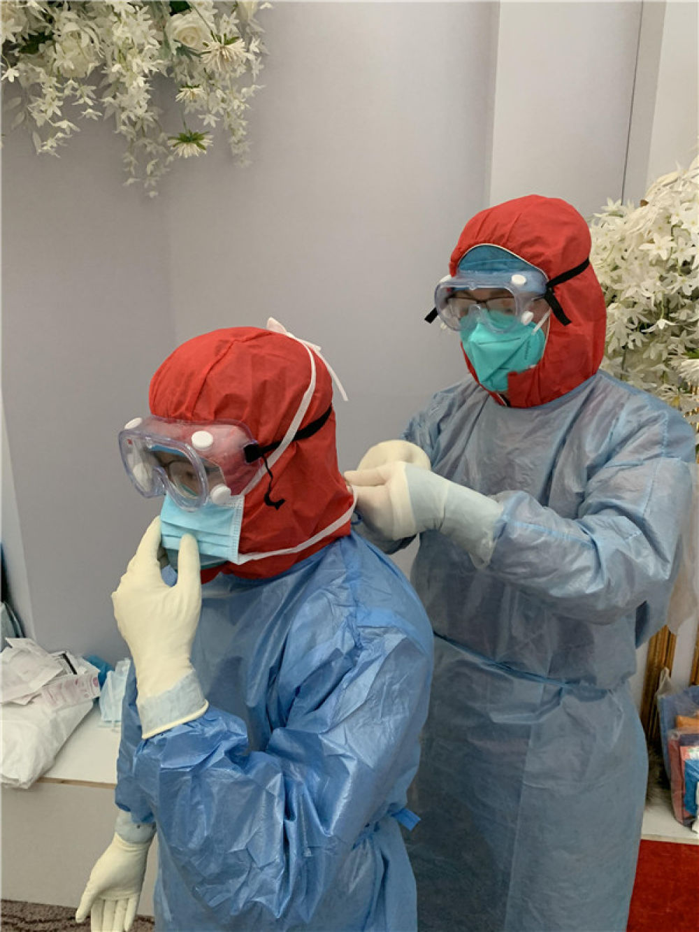 2月28日,于景海(左)和周玲亿准备进入武汉雷神山医院重症病房工作。新华社发(高翔 摄)