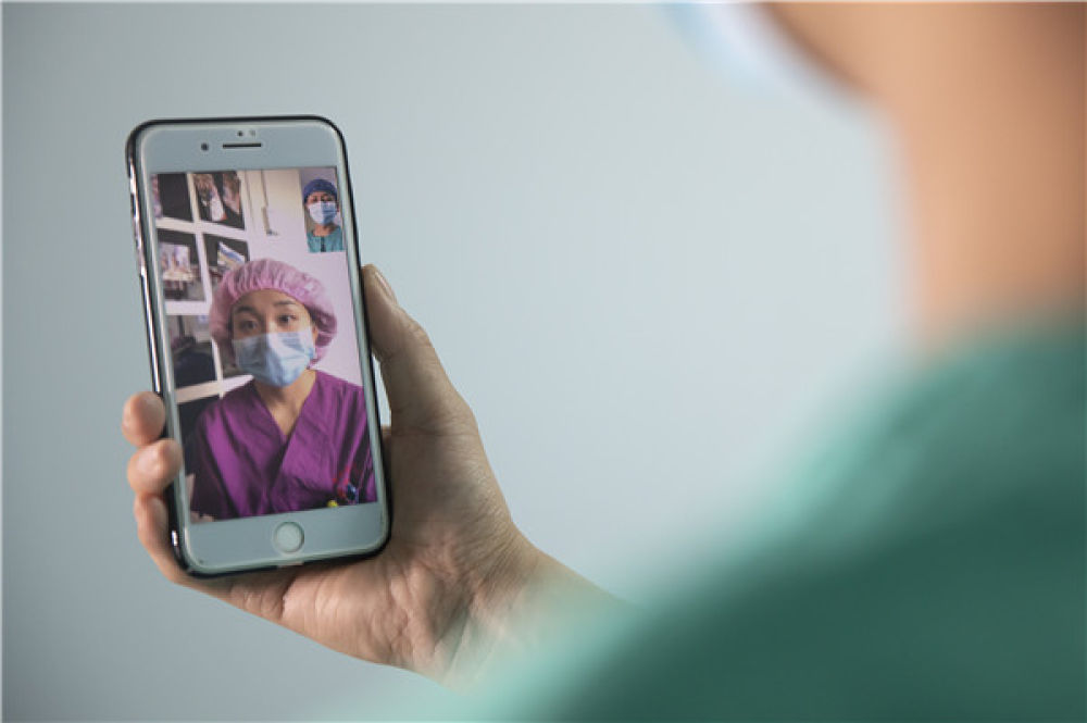 2月24日,在湖北省人民医院光谷院区,来自新疆医疗队1992年出生的吕俊(右)趁着休息间隙和自己远在乌鲁木齐的未婚妻视频聊天。新华社记者 熊琦 摄