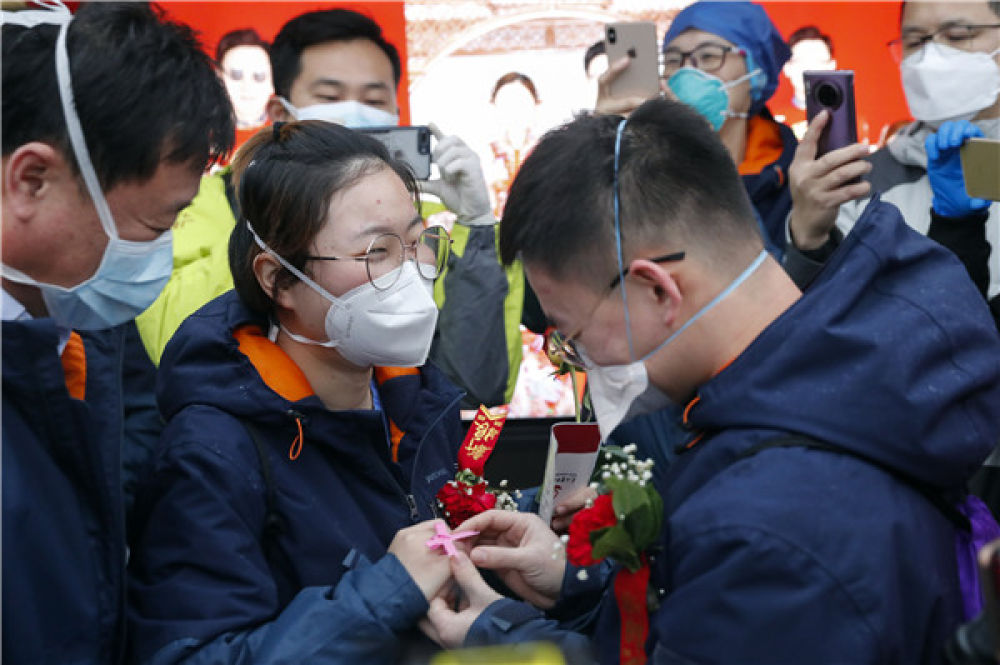 二人原定2月28日举办婚礼。疫情突发,他们果断取消婚礼,驰援武汉。在征得二人同意后,上海第八批支援湖北医疗队决定:在雷神山医院,如期为他们举办婚礼。