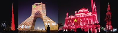 从左至右:阿联酋迪拜哈利法塔、伊朗德黑兰自由塔、埃及开罗萨拉丁城堡和日本东京塔纷纷点亮“中国红”。图片均为新华社发