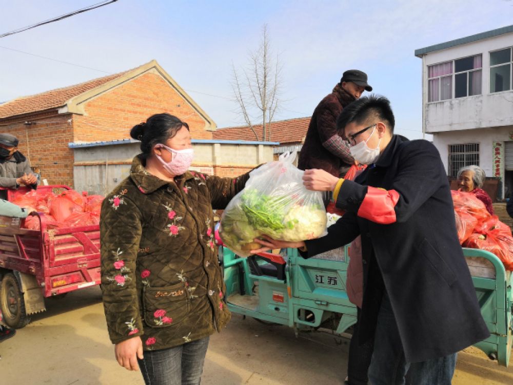 图为安徽省宣城市宣州区纪委监委干部董泽潭为明光市古沛镇大夏村村民发放蔬菜等生活物资。(刘永凤 摄)