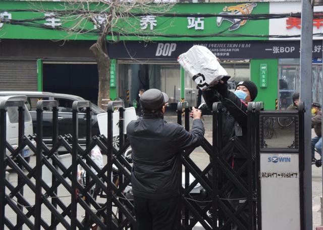 2月28日,天津一小区业主在收取快递包裹。(新华社记者 周润健 摄)