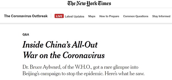 世界卫生组织专家组组长布鲁斯艾尔沃德博士接受《纽约时报》专访时表示,中国的新增病例已经从2月初的每天3000多例降至约200例。就目前而言,世界其他地方出现的新病例要多得多。