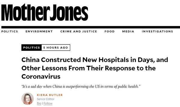 美国《琼斯夫人》(Mother Jones)杂志3月5日的报道也指出,疫情爆发初期,中国投入1800个调查小组,对新冠病毒进行测序调查;中期,中国每周都可产生近200万个核酸检测盒,一天内就能出检测结果;中国在“一瞬间”就建成了2所可容纳2600张病床的医院。“这对疫情防控有很大帮助。”