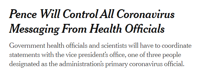 报道援引多位知情人士透露,彭斯要求以后美国政府官员和卫生部门的专家对新冠疫情的公开声明,都必须经过副总统办公室的协调。彭斯为此任命美国国务院抗击艾滋病大使博克斯(Deborah L. Birx)为工作小组的白宫协调员。运作起来,专家需向博克斯汇报,随后博克斯向彭斯汇报,最终彭斯向特朗普汇报。