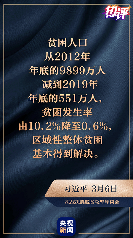 总结当前成就,习近平总书记用了两组数字:脱贫攻坚目标任务接近完成,贫困人口从2012年年底的9899万人减到2019年年底的551万人,贫困发生率由10.2%降至0.6%,区域性整体贫困基本得到解决。