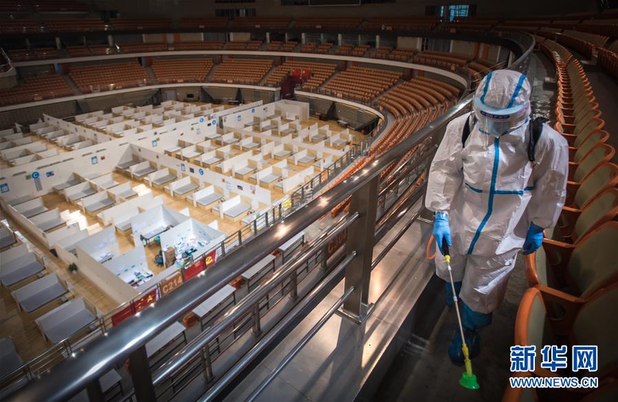 3月8日,来自河南安阳的志愿者柴晓伟在进行消杀作业。 当日,武汉体育中心方舱医院送走最后一批痊愈患者,正式休舱。随后,舱内将进行全面消毒工作。 新华社记者 肖艺九 摄